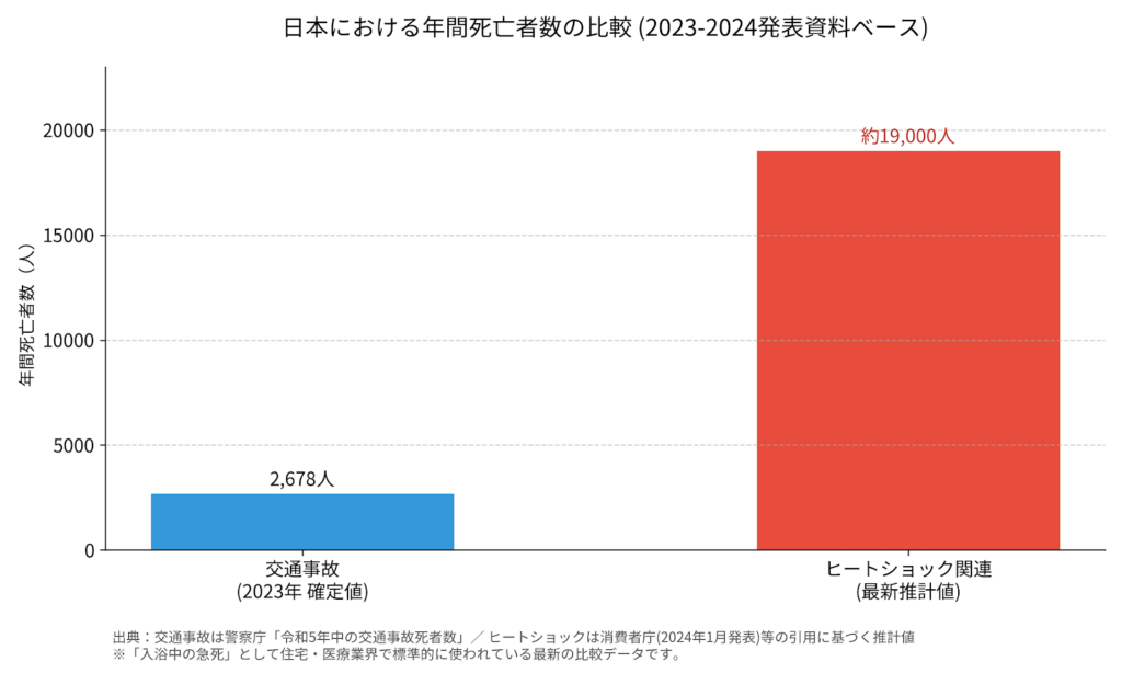 実は、日本国内においてヒートショックに関連して亡くなる方は、年間で推定約19,000人。 これは、交通事故による死亡者数(約2,600人)と比較して、実に約7倍以上という驚くべき数字なんです。